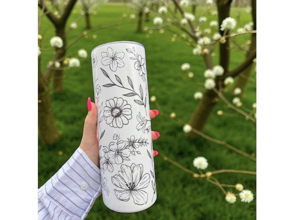 Elegantní kelímek s jemnými černými obrysy květin, který udrží tvůj nápoj teplý nebo studený po dlouhou dobu. Ideální doplněk pro milovníky minimalistického a přírodního designu.